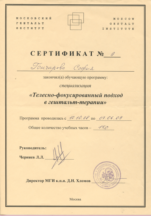 Образование: 2001-2006 - Московский государственный психолого-педагогический университет. Факультет психологического консультирования. Кафедра индивидуальной и групповой психотерапии. Диплом специалиста. 2003-2007 - Московский гештальт институт: "Гештальт-терапия с детьми и семьями" 2008-2009 - Московский гештальт институт: "Телесно-фокусированный подход в гештальт-терапии. 150 часов. 2009-2010 - Московский государственный психолого-педагогический университет: "Понимающая психотерапия. 3-4 ступень" 200 часов. 2010-2011 и 2016-2017 - Московский государственный психолого-педагогический университет: "Интермодальная терапия экспрессивными искусствами. 512 часов.